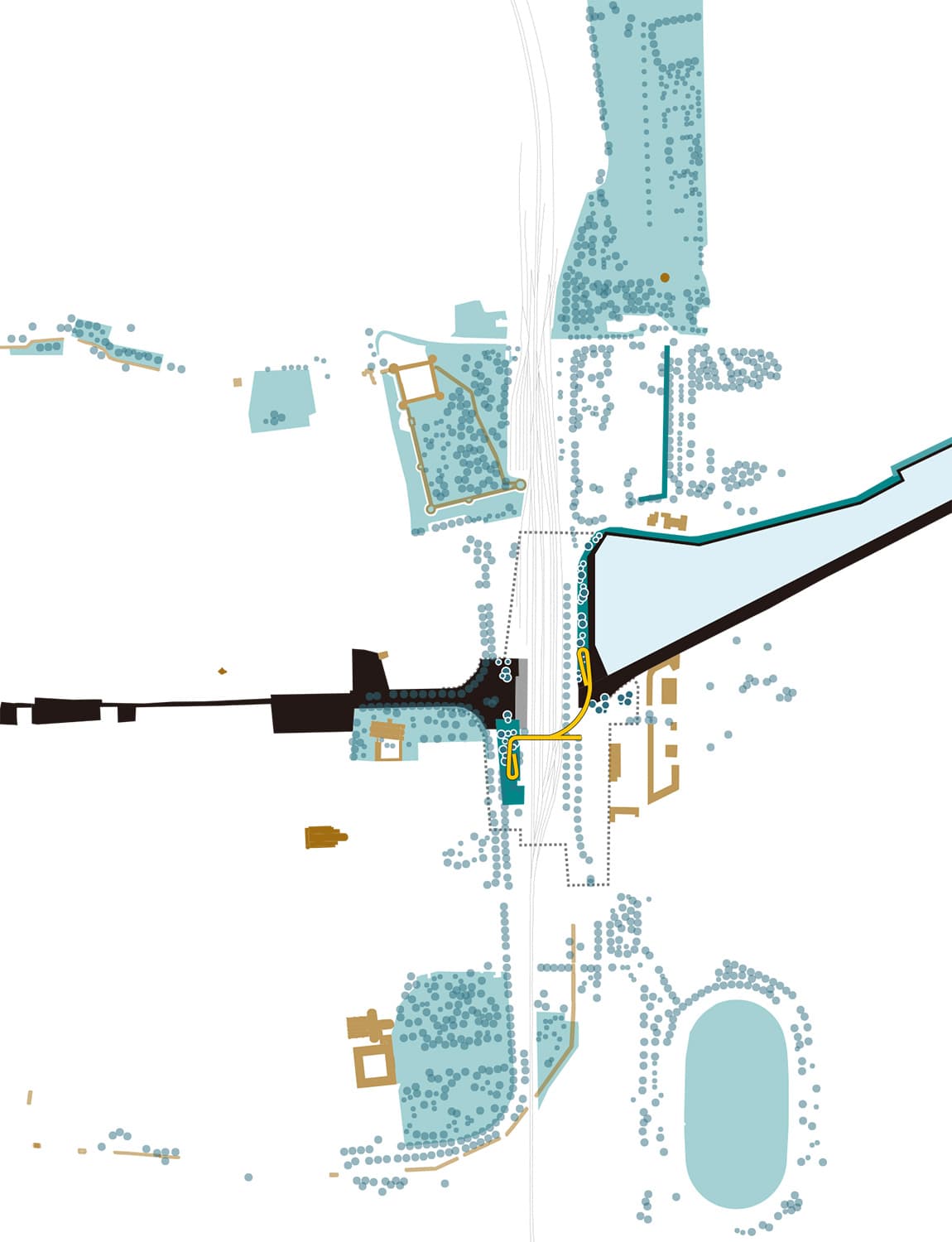 Today the station operates mainly at 180°, that is, towards the city center, although the underpass towards the extra-urban bus station and the new underpass towards the Darsena allow access to the East lot. The project intends to connect the station to the Darsena with a new walkway-belvedere and create an “interchange pole” eastwards of the railways so as to generate a true 360 °hub for diverse ways to enter and exit the city. The proposals integrate the new planned driveway access towards the Darsena with a roundabout between via Darsena and via dell Almagià.