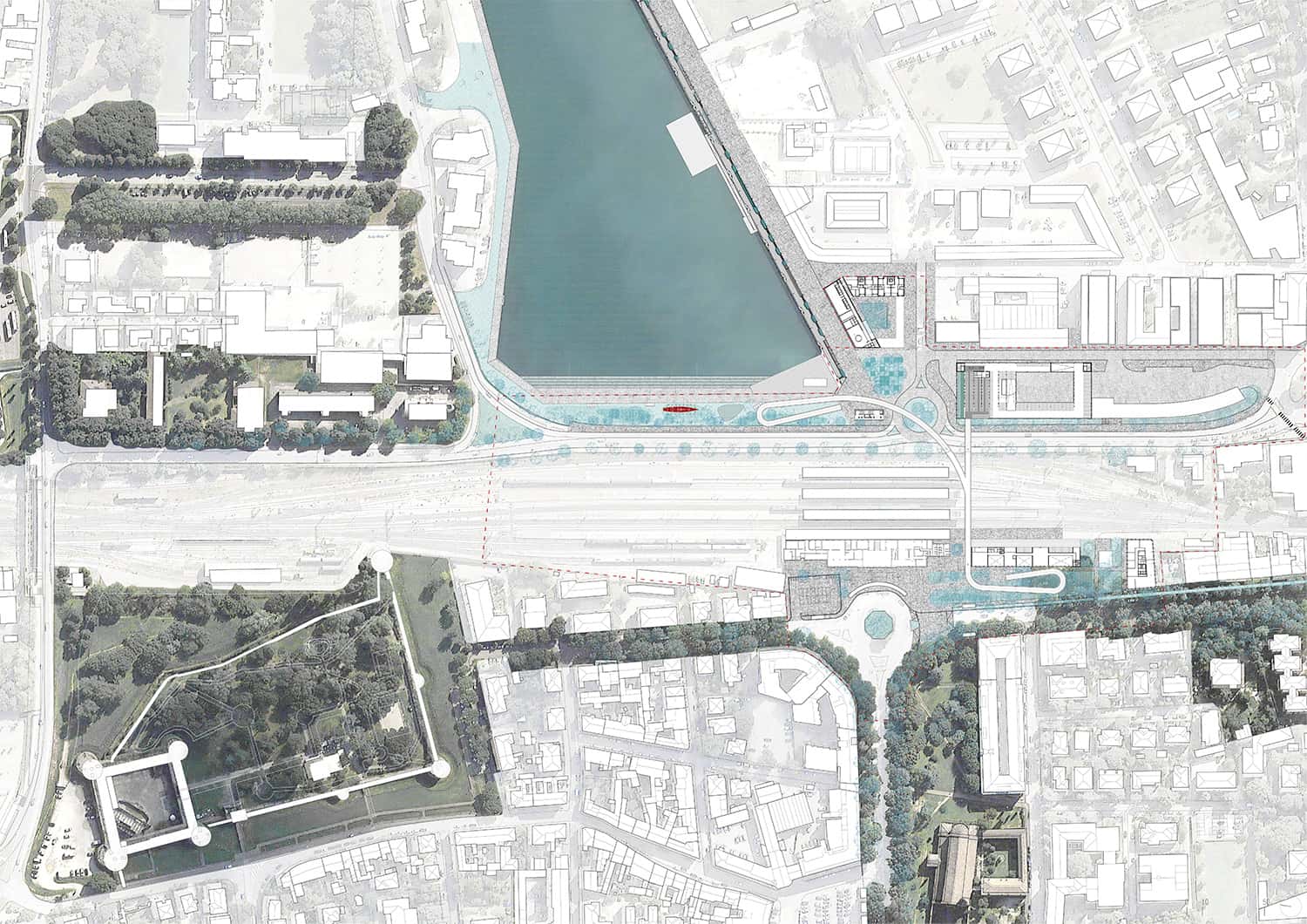 • a walkway-belvedere that creates cycling-pedestrian continuity between the city center and the Darsena and an attractive urban element of new public spaces, like an "urban beach" along the head of the Dock and the "station garden".