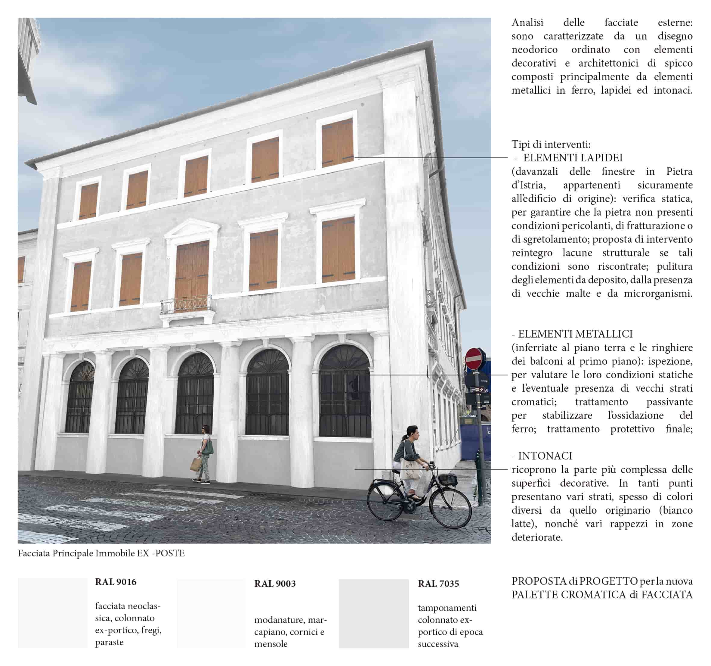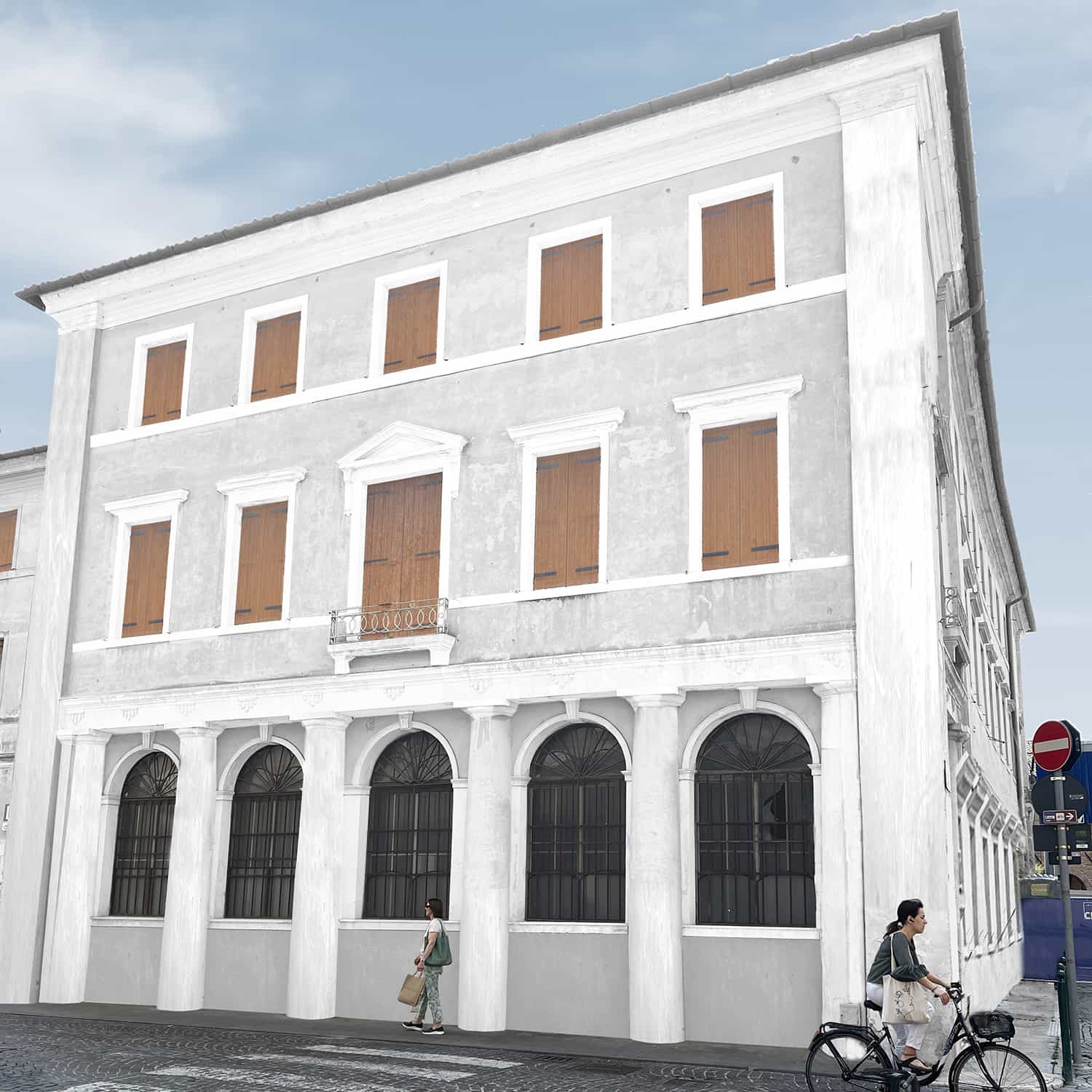 Over time, the building underwent several architectural changes, such as the addition of a portico with Doric columns, which was closed around 1900, and the construction of a second body of the building, first documented in 1912. In the 1970s, a volume was added inside the courtyard, containing the body of the staircase. These transformations led to a closed conformation of the building, characterized by an inner courtyard.