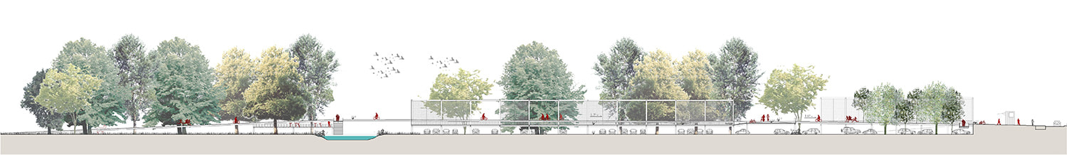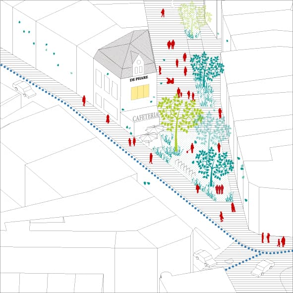 The proposed interventions aim to be maximally sustainable. The focus is on climate robustness and mobility transition. The intention is to follow the standards of the Ecopolism model not for the design of the public space and for the buildings. As regards public space, this means enough space for green-blue functions developed with natural solutions such as: opting for a permeable soil (water management), adding trees (heat island, shading), space to provide green and water, as in the form of play-gardens